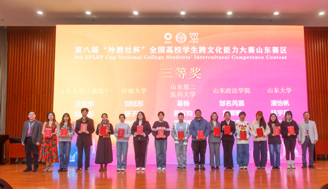 本届“外教社杯”全国高校学生跨文化能力大赛(SNICC)山东省赛由山东省教育厅高等教育处作为指导单位,由山东省本科教育通用外国语种类专业教学指导委员会、山东省本科教育大学外语教学指导委员会、山东省外语职业教育行业教学指导委员会和上海外语教育出版社主办,山东师范大学、山东外贸职业学院承办。大赛助力山东省高校探索国际化人才培养模式创新,提升大学生跨文化交际能力,服务“促进文明交流互鉴、讲好中国故事、传播好中国声音”国家战略,为当代青年学子增强跨文化意识、锻炼跨文化能力提供一个绝佳平台。