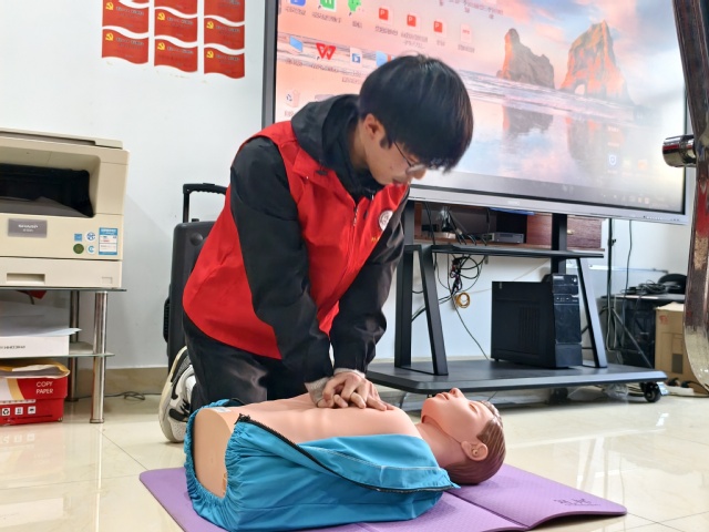 活动现场,志愿者分为两组同步开展服务。第一组聚焦精神宣讲与技能普及,生动讲述我校校友、“见义勇为勇士”“最美医生”张军桥跪地教心肺复苏、舍身救人的先进事迹,传递其“敬佑生命、大爱无疆”的医者精神;同时协助专业人员演示心肺复苏操作流程,向居民讲解技能要点,引导大家掌握基础应急处置方法。第二组深耕卫生服务与秩序保障,通过发放宣传册、现场答疑等方式,向居民普及秋冬季传染病预防、日常卫生安全等知识;在社区体检区域,志愿者主动引导居民有序排队、核对登记信息,为老年群体提供填表协助等贴心服务,让体检流程高效顺畅。