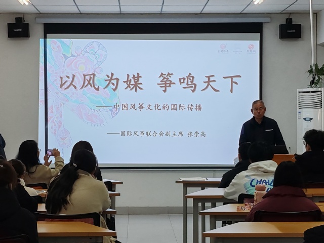 作为山东省首批高校孔子学堂,我校始终以传承弘扬中华优秀传统文化为己任。此次活动聚焦中国风筝的文化内涵与国际传播,创新性地设置了文化解读与精神分享两大核心环节。在文化解读环节,张崇高以“风筝:不止于游戏的文明符号”为核心议题,梳理了中国风筝从东方起源到风靡全球的千年传播脉络。他指出,风筝之所以能跨越国界引发世界共鸣,其密码不仅在于扎制、绘画等精湛的传统非遗技艺,更在于其承载的“金玉满堂”“龙凤呈祥”等东方文化寓意,以及“放飞梦想 拥抱和平”的人类共同追求。